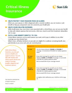 Critical illness insurance provides a financial, lump-sum benefit upon diagnosis of a covered illness. These covered illnesses are typically very severe and likely to render the affected person incapable of working. Because of the financial strain these illnesses can place on individuals and families, critical illness insurance is designed to help you pay your mortgage, seek experimental treatment, or handle unexpected medical expenses.