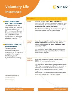 You can also elect and pay for additional life insurance coverage through SunLife for yourself, your spouse and your children. Guaranteed Issue (no medical questions asked) is offered upon initial enrollment in your benefits, and each year during Annual Enrollment, per the table below.