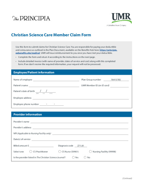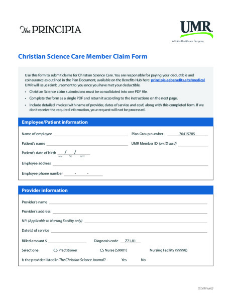 - Submit all your Christian Science care claims, even if you haven’t met your deductible yet – those claims will be applied to your deductible. You will only be reimbursed, though, once you’ve met your deductible.