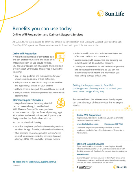 • Up to 5 counseling sessions per claim for legal, financial, and emotional help