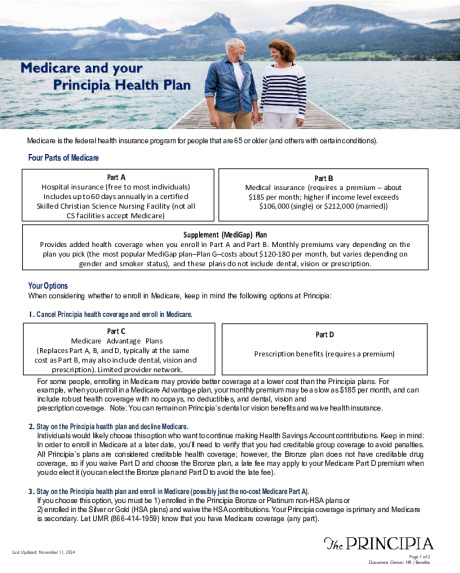You have several options available to you, including staying on Principia’s health plan, enrolling in Medicare, and electing a supplement or advantage plan to add to your Medicare coverage.