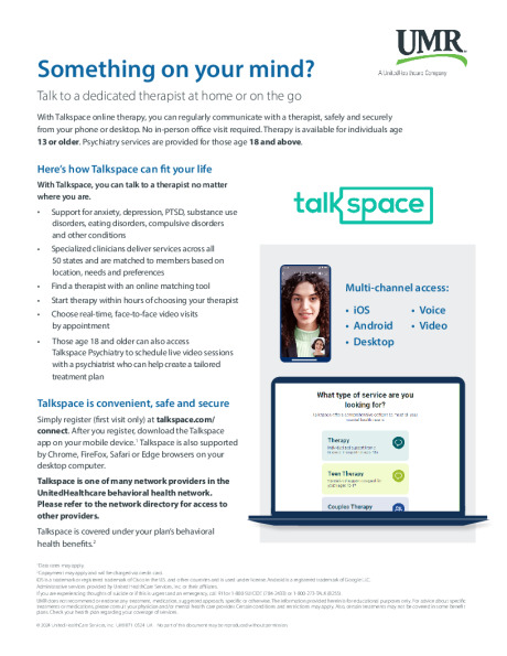 Talkspace is an online therapy service that connects users to a dedicated, licensed therapist in their state of residence 24/7 via private messaging or live sessions, safely and securely from your phone or desktop. No office visit is required. Users can regularly message their dedicated therapist via text, voice or video as life happens—anywhere, anytime. Talkspace has a network of thousands of credentialed clinicians and has been used by over one million people. Talkspace is an In-Network provider.