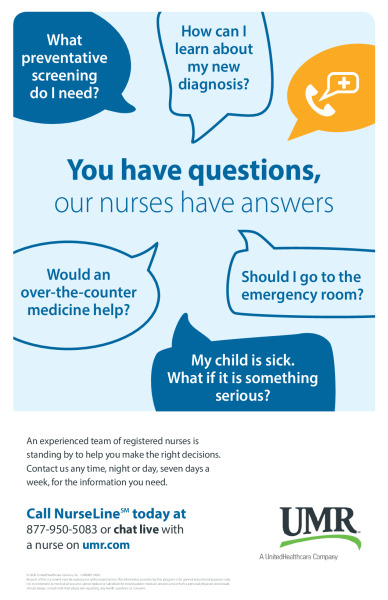 To reach NurseLine, call 877-950-5083 or chat live online by logging in to www.umr.com. Once logged in, select Health Center from the myMenu, then look for the link in the “I need to…” section